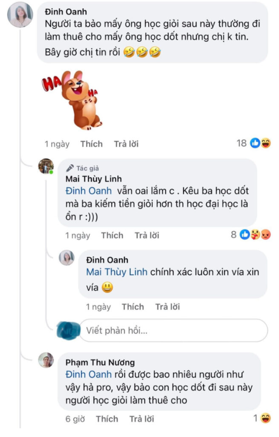 Chị Linh lên bài tự hào vì chồng mình học dốt vcc mà vẫn kiếm được khối tiền hơn hẳn các ông các bà học đại học, thạc sĩ thì nhận được cơn phẫn nộ từ CĐM. Thế đ nào lại có thể lan truyền cái tư tưởng đ cần học hành nghiêm chỉnh, ráng hoàn thành 12 năm học là được, mai mốt ra đường chỉ cần lập kênh tiktok, trở thành idol, làm streamer hay youtuber là sẽ kiếm được khối tiền? Trong khi thu nhập chính của nhà này chủ yếu đến từ các bạn học sinh, sinh viên. Đùa! Bảo thiển cận lại tự ái cơ.